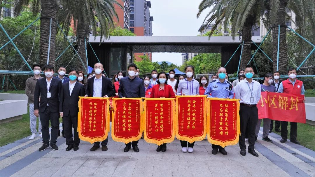 “前海南山、并肩作戰、同心抗疫、深圳加油!”下午六點,伴随嘹亮的口号,前海時代小區現場一片歡騰,火紅的旗幟映照著(zhe)志願者們的笑臉,現場捐贈的錦旗表達著(zhe)全體居民的感謝……