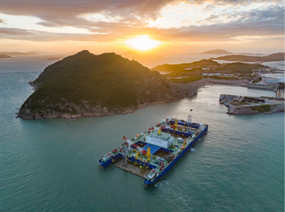 ▲沉管浮運安裝一體船正提帶深中通道(dào)E22管節前往隧址