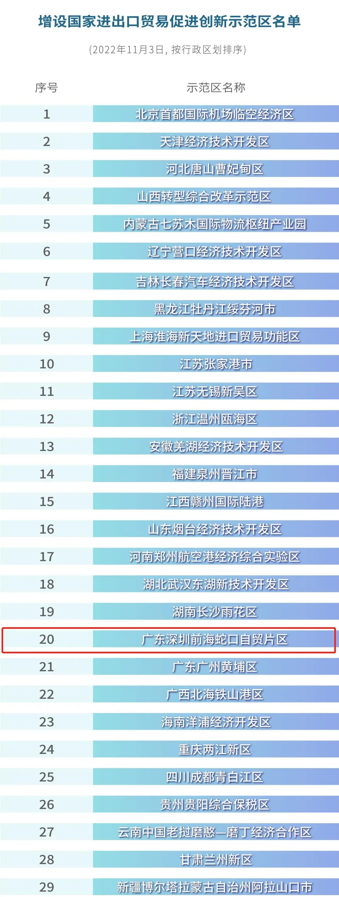 11月3日,據商務部官網發(fā)布“工作通知”稱,商務部等8部門決定增設29個國(guó)家進(jìn)口貿易促進(jìn)創新示範區,廣東深圳前海蛇口自貿片區榜上有名。