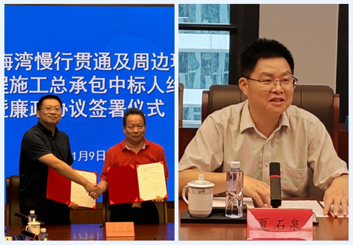 爲确保西灣-前海灣慢行貫通及周邊環境整治項目高質量有序推進(jìn),11月9日下午,前海建投集團在前海大廈舉行項目中标單位見面(miàn)會暨廉政協議簽署儀式,前海建投集團相關分管領導及紀檢監察室(監事(shì)會辦公室)、成(chéng)本采購部、前海環境公司相關負責人,中标單位深圳市森斯環境藝術工程有限公司、中鐵十局集團有限公司主要負責人和項目相關人員參加會議。