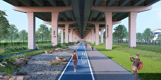 本項目通過(guò)對(duì)高架橋下的空間開(kāi)發(fā)利用和景觀生态改造,打造一個全天候全齡友好(hǎo)的低線運動空間和多功能(néng)活力帶,爲城市居民生活提供一個生态優美的活力舞台,著(zhe)力提升市民幸福感和滿意度,爲深圳生态宜居城市建設賦能(néng)增效。