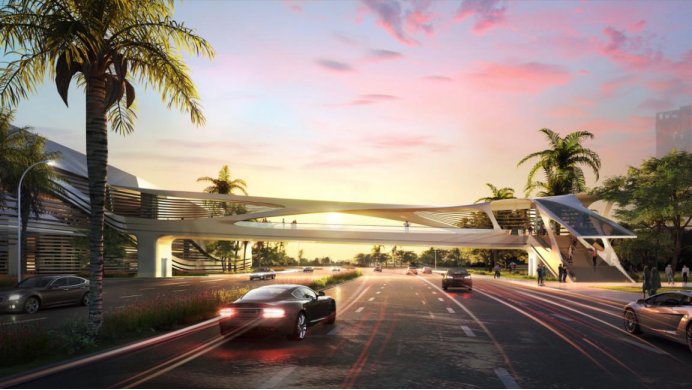項目位于前海會展片區,橫跨展景路,西側接會展高線公園,東側接福海河景觀帶。主橋長(cháng)約66米,寬度約6米,設置梯道(dào)1個及垂直電梯2部,總面(miàn)積約590平方米。橋梁以“會展之眼”爲設計理念,橋梁設計與周邊建築風格相協調,將(jiāng)建築幕牆延伸以及變形。項目建成(chéng)後(hòu),將(jiāng)進(jìn)一步完善會展片區的慢行系統,串聯會展周邊的商業及公共空間,方便片區的市民遊客出行,市民遊客可通過(guò)空中步道(dào)從會展高線公園直達福海河景觀帶。項目計劃近期開(kāi)工。