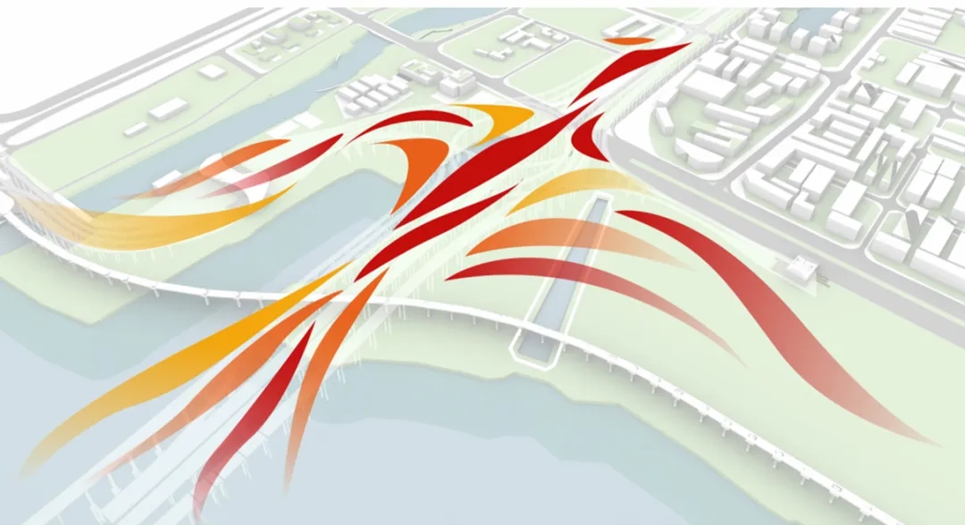 同樣(yàng)以鳳凰爲設計元素,對(duì)門戶界面(miàn)進(jìn)整體打造。在保留場地現有喬木的基礎上,對(duì)缺少綠量的高架橋體兩(liǎng)側補充基底喬木,使大地景觀與立交橋有機融合;在從中山往深圳方向(xiàng)的主要車行視線界面(miàn)片植鳳凰木,形成(chéng)鳳凰展翅的構圖,烘托著(zhe)鳳起(qǐ)潮湧主題氛圍。