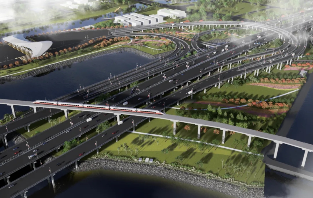 再者,高架橋交彙之處,挺拔翠綠的南洋楹大喬木爲橋體周邊增添了綠意盎然的自然氣息。高架之下,蜿蜒的遊園道(dào)路搭配開(kāi)花喬木,形成(chéng)“地景+花喬”點綴效果。