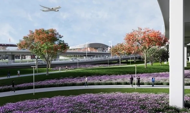 首先,作爲核心景觀的鳳凰木群植區域沿高架橋兩(liǎng)側呈矩陣式布局,強化門戶界面(miàn)序列感和氛圍的同時,爲景觀增添獨特的标識性。