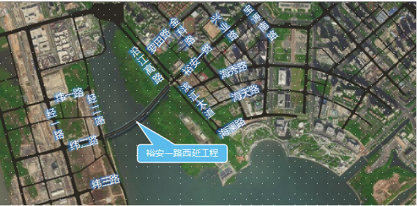 裕安一路西延工程西起(qǐ)經(jīng)二路,跨越前海灣水域,東至濱江大道(dào),全長(cháng)約972m,爲雙向(xiàng)6車道(dào),城市主幹道(dào),設計速度50km/h。項目包含跨海特大橋一座,全橋長(cháng)度約772m,橋型爲拱形塔斜拉橋。項目建設内容包括:道(dào)路、橋梁、給排水、電力、通訊、照明、交通安全設施、綠化、交通疏解和其他附屬工程等。