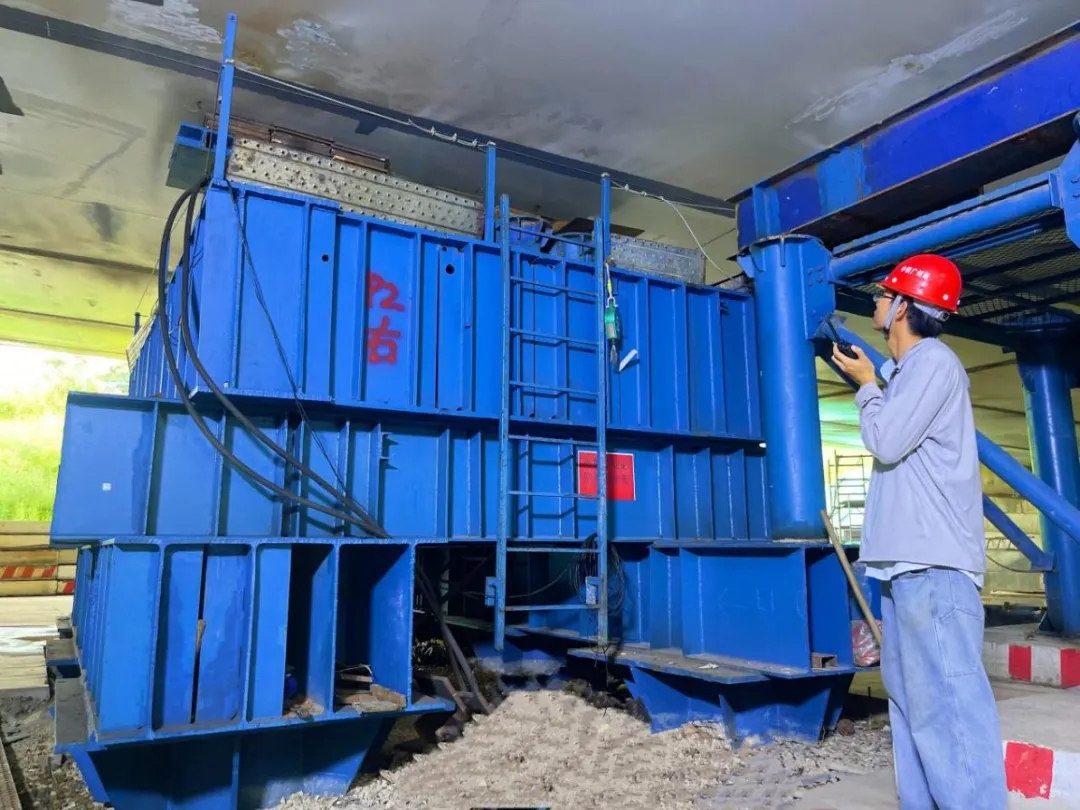 在落梁過(guò)程中,項目部在現場設置指揮室,通過(guò)施工監控系統、集成(chéng)操控平台,實現對(duì)現場情況的動态掌控,精準控制各支墩反力大小及落梁高度,保障鋼箱梁成(chéng)橋線型優美和主梁應力安全不超限,將(jiāng)每級落梁均控制在100毫米以内,最終安全精準地實現了落梁。