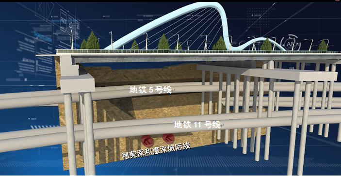 地鐵保護方面(miàn):地鐵5、11号線以及遠期預留的穗莞深城際均位于橋梁正下方,橋梁樁基距離盾構結構最近2.88米,承台底部距離盾構結構4.65米。受3條已運營地鐵線影響,施工過(guò)程始終以地鐵保護爲核心,加強全鋼護筒全回轉鑽機樁基施工工法控制,以地鐵隧道(dào)自動化監測數據指導施工,曆時3個月完成(chéng)全橋41根樁基施工。采用豎井跳挖法和噴錨支護法施工完成(chéng)大尺寸承台,确保地鐵保護變形控制參數在4mm以内。