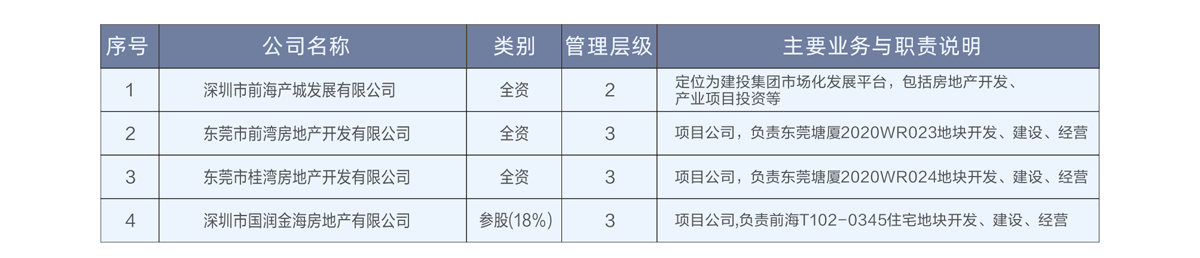 爲城市産業發(fā)展提供營商環境配套,鍛造美好(hǎo)生活标杆。主要負責推進(jìn)大灣區内房地産項目開(kāi)發(fā),包括高端住宅及商業項目的投資、建設、銷售及持有運營等全鏈條開(kāi)發(fā)運作體系等。該闆塊主要由前海四家地産開(kāi)發(fā)公司負責實施。